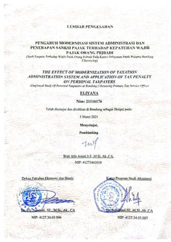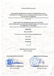 Eliyana, Eliyana (2021) Pengaruh Modernisasi Sistem Administrasi Dan Penerapan Sanksi Pajak Terhadap Kepatuhan Wajib Pajak Orang Pribadi. Other thesis, Universitas Komputer Indonesia.