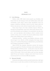 Diabetes melitus (DM) adalah sebuah penyakit yang disebabkan oleh banyak faktor bisa dari kurangnya insulin atau ketidakmampuan tubuh untuk memanfaatkan insulin dengan simtoma berupa hiperglikemia kronis dan gangguan metabolisme karbohidrat, lemak dan protein sebagai akibat dari defisiensi atau aktivitas insulin, defisiensi transporter glukosa atau keduanya. Selain dengan diagnosa lab, dalam melakukan diagnosis diabetes ada beberapa hal yang diperhatikan, seperti umur, tekanan darah, keturunan. Poin – poin ini bisa digunakan untuk mendiagnosis seseorang diabetes atau tidak. Dari poin – poin yang digunakan untuk mendiagnosa diabetes membuat metode machine learning, pattern recognition dan metode statistika lainnya menjadi pilihan untuk melakukan diagnosis pasien diabetes. Untuk melakukan klasifikasi, dalam penelitian ini digunakan metode Smooth Support Vector Machine (SSVM). Sebelum prediksi dilakukan, terlebih dahulu akan dilakukan preprocessing yang berupa filtering dan normalisasi, selain preprocessing metode optimasi feature selection berupa sequential forward selection akan digunakan untuk mengoptimalkan dataset yang digunakan. Untuk mendapatkan solusi optimal, dalam penelitian ini mengkombinasikan metode – metode tersebut dengan hasil 79.24%. Hasil tersebut menunjukkan bahwa metode yang digunakan dapat menghasilkan solusi yang optimal.