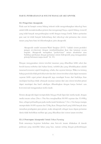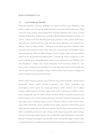 Kegiatan berkebun atau bercocok tanam biasanya dilakukan didaerah pedesaan dan masih menggunakan cara tanam konvensional. Seiring berkembangnya teknologi saat ini kegiatan berkebun bisa dilakukan didaerah perkotaan dengan memanfaatkan lahan yang terbatas atau lebih populer disebut urban farming. Banyak metode yang dilakukan dalam kegiatan urban farming, namun semakin berkembangnya teknologi dalam berkebun banyak inovasi yang dilakukan agar lebih cocok diterapkan didaerah perkotaan seperti akuaponik. Namun pemanfaatan akuaponik di Indonesia masih sedikit padahal memiliki berbagai keunggulan dibandingkan dengan sistem tanam konvensional salah satunya adalah hemat air. Agar akuaponik lebih populer perlu dilakukan beberapa sosialisasi baik dari pemerintah atau komunitas dan juga perlu dilakukan beberapa tahapan untuk mengetahui dan membuat media yang cocok dan tepat diterpakan di masyarakat.