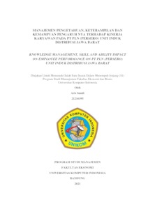 Penelitian ini bertujuan untuk mengetahui pengaruh Manajemen Pengetahuan, Keterampilan dan Kemampuan terhadap Kinerja Pegawai pada PT. PLN (Persero) Unit Induk Distribusi Jawa Barat baik secara parsial maumpun simultan. Metode metode penelitian yang di gunakan adalah Deskriptif Verifikatif sedangkan dengan sampel berjumlah 63 orang menggunakan rumus slovin. Pengumpulan data di lakukan melalui Observasi, Wawancara dan Kuisioner, alat analisi yang di gunakan adalah regresi linier berganda. Hasil penelitian menunjukan bahwa Manajemen Pengetahuan berpengaruh terhadap kinerja karyawan pada PT. PLN (Persero) Unit Induk Distribusi Jawa Barat sebesar 12,4%, Keterampilan berpengaruh posistif terhadap kinerja karyawan pada PT. PLN (Persero) Unit Induk Distribusi Jawa Barat sebesar 14,8%, Kemampuan berpengaruh posistif terhadap kinerja karyawan pada PT. PLN (Persero) Unit Induk Distribusi Jawa Barat sebesar 27%, Sehingga dapat diketahui bahwa variable Kemampuan memberikan kontribusi yang lebih dominan terhadap Kinerja karyawan pada PT. PLN (Persero) Unit Induk Distribusi Jawa Barat. Manajemen Pengetahuan, Keterampilan dan Kemampuan secara bersamaan berpengaruh signifikan terhadap kinerja karyawan pada PT. PLN (Persero) Unit Induk Distribusi Jawa Barat.