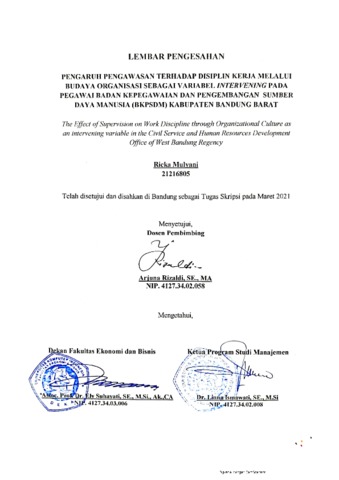 Mulyani, Ricka (2021) Pengaruh Pengawasan Terhadap Disiplin Kerja Melalui Budaya Organisasi Sebagai Variabel Intervening Pegawai Pada Badan Kepegawaian dan Pengembangan Sumber Daya Manusia. Other thesis, Universitas Komputer Indonesia.