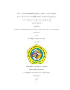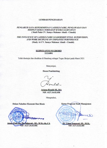 Nugroho, Sudwiyanto (2021) Pengaruh Gaya Kepemimpinan Kerja Laissez-Faire, Pengawasan Dan Disiplin Kerja Terhadap Kinerja Karyawan (Studi Pada Cv. Samyo Makmur AbadiKota Cimahi). Other thesis, Universitas Komputer Indonesia.