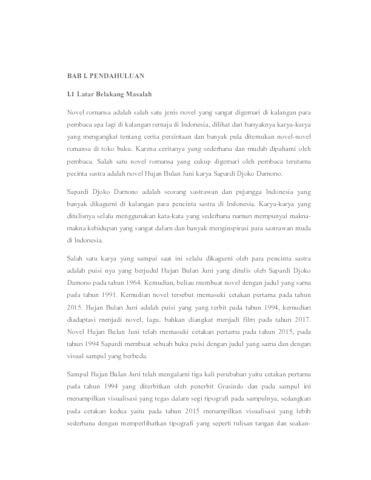 Keindahan dalam sastra dapat dirasakan melalui pemilihan kata-kata indah yang senantiasa membuat hati dan pikiran terbawa suasana ketika membaca sebuah karya sastra. Begitupun dengan novel, karya sastra satu ini dapat membawa pembacanya kepada suasana yang ada di dalam novel tersebut. Novel adalah sebuah cerita berbentuk fiksi yang terdapat alur, tokoh, latar tempat, dan konflik yang dapat memunculkan sebuah kisah dari peristiwa-peristiwa yang terjadi pada tokoh-tokoh cerita tersebut. Hujan Bulan Juni merupakan novel yang ditulis oleh sastrawan dan pujangga Sapardi Djoko Damono yang menceritakan sebuh kisah cinta yang penuh lika-liku dan perjuangan. Salah satu elemen penting yang terdapat pada sebuah buku adalah sampul, dimana sampul dapat mewakili sebuah isi cerita yang terkandung pada buku. Selain sebagai pelindung, sampul juga dapat memberikan kesan keindahan bagi setiap orang yang melihatnya. Dapat terjadi sebuah perubahan dalam sebuah sampul novel, mulai dari perubahan visual, tipografi, ataupun aspek-aspek lain nya yang menjadikan sampul novel bisa lebih menarik dan mendapatkan perhatian lebih bagi para pembaca.