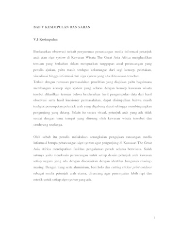 Pariwisata telah menjadi komoditas yang dibutuhkan masyarakat saat ini sebagai pelepas penat di tengah kesibukan sehari-hari. Oleh karena itu telah banyak berbagai jenis tempat wisata yang ditawarkan mulai dari pariwisata alami hingga pariwisata buatan manusia. The Great Asia Africa yang berada di kawasan Lembang, Kabupaten Bandung Barat merupakan salah satu tempat wisata yang dirancang untuk dapat merasakan pengalaman keliling dunia secara tidak langsung. Tempat wisata ini secara khusus menawarkan kepada para pengunjungnya untuk dapat mengenal dan menjelajahi situs bersejarah/khas yang tersebar di kawasan Asia dan Afrika.. Namun berdasarkan hasil observasi yang dilakukan ditemukan adanya indikasi kuat bahwa di kawasan wisata ini, sign system yang ada masih belum komprehensif dalam memberikan informasi visual yang baik. Selain itu penempatan petunjuk arah yang sering kali digabung membuat pengunjung sering kali kesulitan untuk memahaminya sehingga pengalaman pengunjung tidak penuh. Oleh karena itu, perancangan ulang dengan memerhatikan kekurangan yang telah disebut tadi penting untuk dilakukan, baik secara visual maupun penempatan agar proses penyampaian pesan melalui sign system lebih komprehensif.