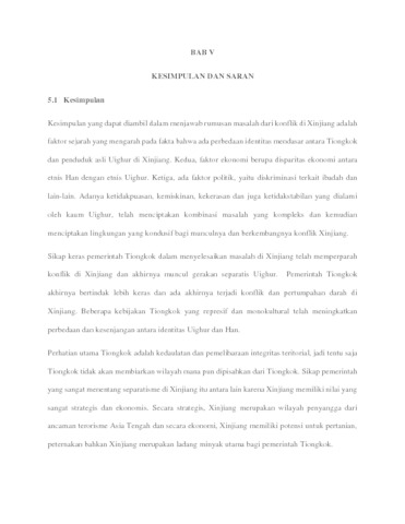 Skripsi ini berfokus pada konflik Xinjiang sebagai salah satu dari kasus konflik internal yang terjadi di Tiongkok. Sebagai negara maju, Tiongkok tetap terkait erat dengan masalah konflik internal. Konflik Xinjiang merupakan konflik antara kelompok etnis Uighur dan Han yang kemudian dipicu oleh ketimpangan ekonomi, ketidakpuasan, ketidakadilan dan kekerasan yang terkuak secara serentak di Xinjiang. Uighur, sebuah kelompok etnis Muslim, sedang berkonflik dengan pihak berwenang Tiongkok. Pada perkembangannya, muncul beberapa respon dari dunia internasional. Keberlangsungan konflik ini salah satunya disebabkan oleh kepentingan negara Tiongkok terhadap Xinjiang. Xinjiang merupakan wilayah potensial bagi Tiongkok, baik secara geografi maupun ekonomi.