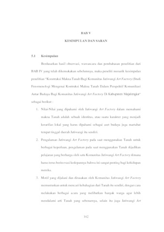 Penelitian ini memberikan pengetahuan baru bagi Komunitas Jatiwangi Art Factory, masyarakat dan juga peneliti selanjutnya mengenai Konstruksi Makna Tanah Bagi Komunitas Jatiwangi Art Factory di Kabupaten Majalengka. Saran penelitian ini, agar Jatiwangi Art Factory selalu terus berusaha berinteraksi dengan warganya, menambah orang lapangan, dan lebih berani lagi untuk menciptakan gebrakan gebrakan baru lagi.