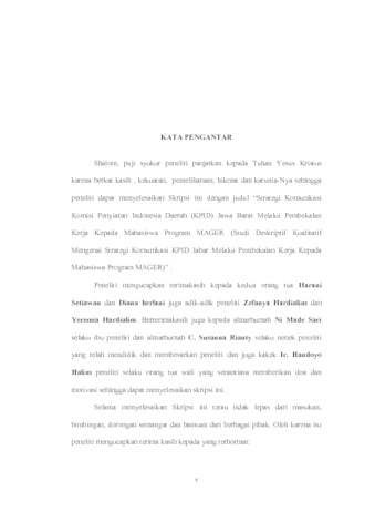 Penelitian ini untuk mengetahui Strategi Komunikasi Komisi Penyiaran Indonesia Daerah Jawa Barat Melalui Pembekalan Kerja Kepada Mahasiswa MAGER. Penelitan ini meneliti program MAGER (Magang Rasa Kerja) yang diadakan KPID Jawa Barat. Penelitian ini menggunakan empat subfokus yaitu pesan, media, hambatan, dan evaluasi.