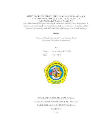Putra, Maharadi (2021) Strategi Komunikasi Biro Layanan Kerjasama & Kehumasan Lembaga Ilmu Pengetahuan Indonesia Kawasan Bandung. Other thesis, Univeristas Komputer Indonesia.