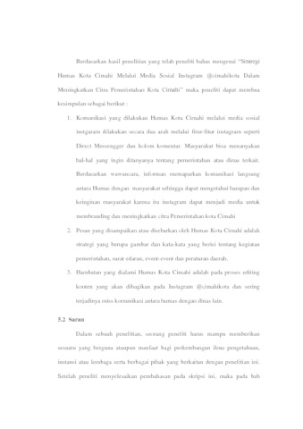 Maksud penelitian ini untuk mengetahui Strategi Humas Kota Cimahi melalu Media sosial Instagram @cimahikota dalam Meningkatkan Citra pemerintahan Kota Cimahi , dengan subfokus komunikasi, pesan, dan hambatan. Penelitian ini menggunakan metode Kualitatif dengan desain studi Deskriptif. Infoman juga ditentukan mlalui teknik purposive sampling dengan memilih informan sesuai dengan yang dibutuhkan. Data penelitian diperoleh melalui wawancara mendalam, observasi non partisipan, internet searching, studi pustakan, dan dokumentasi. Hasil penelitian menunjukan komunikasi yang dilakukan Humas Kota Cimahi secara tidak langsung (online) melalui fitur-fitur instgram seperti Direct Messengger, kolom komentar dan email. Pesan yang disampaikan oleh Humas Kota Cimahi merupakan pesan yang disampaikan dalam bentuk gambar, kata-kata melalui media sosial instagram yang informatif dan persuasif dalam meningkatkan Citra Pemerintahan Kota Cimahi. Hambatan yang dialami Humas Kota Cimahi adalah proses editing konten yang akan dibagikan di Instagram @cimahikota, serta koordinasi pihak humas dan dinas lain. Tujuan Humas Kota Cimahi melakukan kegiatan meningkatkan citra Pemrintahan Kota Cimahi melalui media sosial insgram karena media sosial instagram saat ini yang paling banyak digunakan oleh masyarakat, serta media sosial instagram dapat diakses dengan mudah dan dapat diakses dengan cepat kapanpun dan dimanapun.