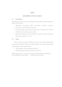 penelitina ini berfokus pada penggunaan geographic information System (GIS) dalam membantu pihak museum geologi bandung dalam membuat peta ditemukannya fosil dan membantu masyarakat dalam mencari informasi dari jarak jauh dikarekana covid-19 yang belum usai. metode yang digunanakan mengunakan waterfall yaitu dengan Analisa kebutuhan yang ada dimuseum, Perancangan menrancang struktur yang akan dibangun untuk kebutuhan yang ada dimuseum, Penulisan Kode Program menulis program dengan php, dan java script lalu, Pengujian apakah web tersebut bisa dipakai untuk membantu pihak museum dalam menjalankan perkerjaannya,