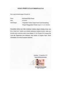 Hanapi, Mochamad Rifqi (2021) Pengenalan Tulisan Tangan Huruf Latin Bersambung Dengan Menggunakan Metode Support Vector Machine. Other thesis, Univeristas Komputer Indonesia.