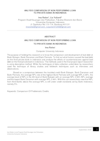 Ratiwi, Ima (2018) Analisis Perbandingan Kredit Bermasalah Pada Bank Swasta Di Indonesia Periode 2012-2016 (Bank Bukopin, Bank Danamon Dan Bank Permata). Diploma thesis, Universitas Komputer Indonesia.