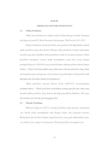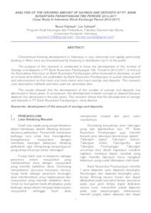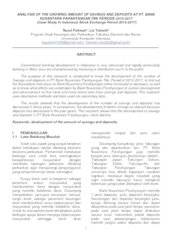 Perkembangan perbankan konvensial di Indonesia ini sangat maju dan pesat khususnya perbankan didaerah Jawa Barat ditandai dengan pembiayaan atau penyaluran kepada masyarakat. Tujuan dilakukan penelitian ini adalah untuk mengetahui Perkembangan Jumlah Tabungan dan Deposito pada PT. Bank Nusantara Parahyangan Tbk Periode 2013-2017, untuk mengetahui fluktuasi yang terjadi pada Bank Nusantara Parahyangan baik itu peningkatan maupun penurunan, serta untuk mengetahui upaya apa saja yang dilakukan oleh Bank Nusantara Parahyangan untuk mempertahankan perkembangan dan kemajuan agar semakin banyak nasabah yang mempunyai tabungan dan deposito. Penelitian ini menggunakan metode deskriptif dan data yang digunakan adalah data sekunder. Hasil penelitian menunjukkan bahwa perkembangan jumlah tabungan dan deposito mengalami penurunan pada tahun-tahun tertentu. Bila dibandingkan, perkembangan tabungan lebih baik dari pada deposito karena deposito mengalami penurunan pada tahun-tahun sebelumnya. Penelitian ini menunjukkan bahwa perkembangan tabungan dan deposito pada PT. Bank Nusantara Parahyangan lebih banyak mengalami penurunan.