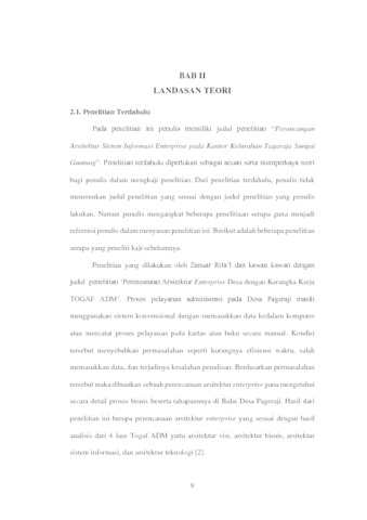 Kantor Kelurahan Tagaraja Sungai Guntung adalah salah satu lembaga pemerintah yang bertugas memberikan pelayanan administrasi kepada masyarakat pada tingkat desa. Dilihat dari struktur organisasi terdapat berbagai bidang yang mengatur urusan seperti pengelolaan surat masuk dan surat keluar, kepegawaian, kearsipan, dan lain-lain. Kantor Kelurahan Tagaraja saat ini belum mampu mendukung strategi organisasi secara maksimal. Hal ini dikarenakan belum adanya sistem informasi yang mendukung setiap proses pertukaran data dari dari masing-masing bidang pengelolaan. Peran Teknologi Informasi (TI) yang merupakan bagian dari Sistem Informasi (SI) sebagai alat pendukung dalam organisasi telah menjadi bagian dari strategi organisasi untuk mencapai tujuannya. Namun, masalah saat ini adalah tidak mudah untuk mengimplementasikan sistem informasi untuk kepentingan seluruh organisasi. Perlu ada keselarasan antara strategi bisnis dan strategi teknologi. Keselarasan sistem informasi dengan kebutuhan organisasi dapat ditentukan dengan memperhatikan faktor integrasi dalam pengembangannya. Oleh karena itu, perlu dirancang sebuah arsitektur sistem informasi enterprise yang tepat agar dapat mencapai tujuan strategisnya yang sesuai dengan visi dan misi Kantor kelurahan Tagaraja. Untuk merancang arsitektur enterprise, diperlukan metode yang lengkap dan mudah untuk digunakan. Penelitian ini menggunakan pendekatan kualitatif dan metode pengumpulan data berupa studi literatur, wawancara dan observasi langsung, serta menggunakan TOGAF ADM sebagai metode perancangan arsitektur. Hasil dari penelitian ini adalah menghasilkan blueprint dari arsitektur sistem informasi yang dapat menunjang proses bisnis di Kantor Kelurahan Tagaraja.