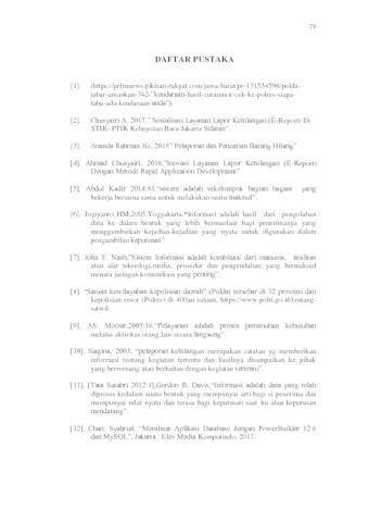 | Uncontrolled Keywords: | Pelayanan, pelaporan, kehilangan, curanmor, website, database MySQL |