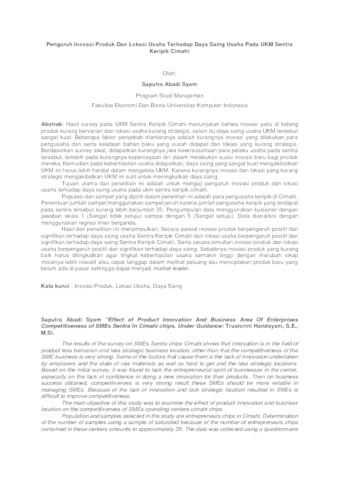 Hasil survey pada UKM Sentra Keripik Cimahi menunjukan bahwa inovasi yaitu di bidang produk kurang bervarian dan lokasi usaha kurang strategis, selain itu daya saing usaha UKM tersebut sangat kuat. Beberapa faktor penyebab diantaranya adalah kurangnya inovasi yang dilakukan para pengusaha dan serta keadaan bahan baku yang susah didapat dan lokasi yang kurang strategis. Berdasarkan survey awal, didapatkan kurangnya jiwa kewirausahaan para pelaku usaha pada sentra tersebut, terlebih pada kurangnya kepercayaan diri dalam melakukan suatu inovasi baru bagi produk mereka. Kemudian pada keberhasilan usaha didapatkan, daya saing yang sangat kuat mengakibatkan UKM ini harus lebih handal dalam mengelola UKM. Karena kurangnya inovasi dan lokasi yang kurang strategis mengakibatkan UKM ini sulit untuk meningkatkan daya saing . Tujuan utama dari penelitian ini adalah untuk menguji pengaruh inovasi produk dan lokasi usaha terhadap daya saing usaha pada ukm sentra keripik cimahi. Populasi dan sampel yang dipilih dalam penelitian ini adalah para pengusaha keripik di Cimahi. Penentuan jumlah sampel menggunakan sampel jenuh karena jumlah pengusaha keripik yang terdapat pada sentra tersebut kurang lebih berjumlah 35. Pengumpulan data menggunakan kuisioner dengan jawaban skala 1 (Sangat tidak setuju) sampai dengan 5 (Sangat setuju). Data dianalisis dengan menggunakan regresi linier berganda.