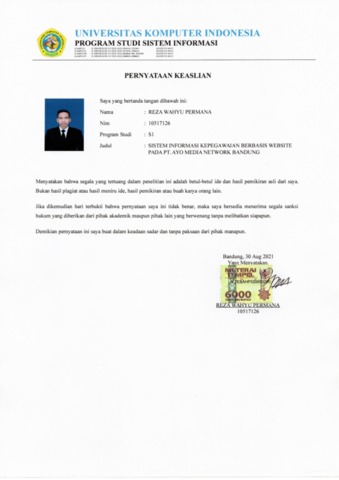 Permana, Reza Wahyu (2021) Sistem Informasi Kepegawaian Berbasis Web Pada Pt. Ayo Media Network Bandung. Other thesis, Univeristas Komputer Indonesia.