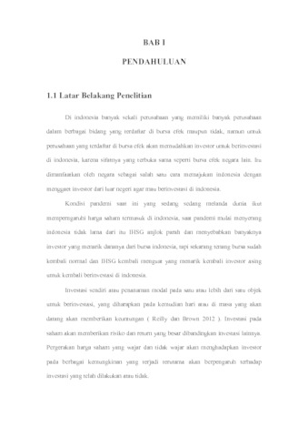 Investasi di indonesia sangat bagus karena memiliki perusahaan di berbagai bidang yang terdaftar di bursa, yang dimana dapat dimanfaatkan untuk menarik investor asing berinvestasi diindonesia. Pandemi yang melanda dunia menyebabkan IHSG anjlok namun sekarang bursa sudah normal kembali.investasi sendiri yaitu menanamkan modal pada suatu entitas yang dirasa layak agar mendapatkan keuntungan di masa depan namun tetap ada risikonya dengan pedoman higt risk hight return. Volatilitas yaitu gap antara jumlah tahun sekarang dengan tahun sebelumnya yang dihitung menggukanakan statistik.