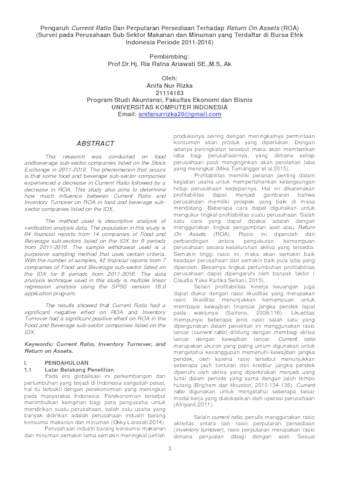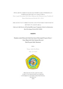 Penelitian ini dilakukan pada perusahaan sub sektor makanan dan minuman yang terdaftar di BEI tahun 2011-2016. Fenomena yang terjadi yaitu pada beberapa perusahaan sub sektor makanan dan minuman yang mengalami penurunan Current Ratio yang diikuti ROA yang menurun. Penelitian ini juga bertujuan untuk mengetahui seberapa besar pengaruh antara Current Ratio dan Perputaran Persediaan terhadap ROA pada perusahaan sub sektor makanan dan minuman yang terdaftar di BEI. Metode yang digunakan adalah analisis deskriptif data analisis verifikatif. Populasi dalam penelitian ini adalah 84 laporan keuangan dari 14 perusahaan sub sektor Makanan dan Minuman yang terdaftar di BEI selama 6 periode dari tahun 2011-2016. Penarikan sampel yang dipergunakan adalah metode purposive sampling yang menggunakan kriteria tertentu. Dengan jumlah sampel yaitu 42 laporan keuangan dari 7 perusahaan sub sektor Makanan dan Minuman yang terdaftar di BEI selama 6 periode dari tahun 2011-2016. Teknik analisis data yang digunakan dalam penelitian ini adalah analisis regresi linear berganda dengan menggunakan program aplikasi SPSS versi 16.0. Hasil penelitian menunjukkan bahwa Current Ratio berpengaruh signifikan negatif terhadap ROA dan Perputaran Persediaan berpengaruh signifikan positif terhadap ROA pada perusahaan sub sektor Makanan dan Minuman yang terdaftar di BEI.