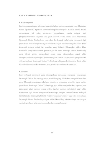 Gitar custom merupakan sebuah gitar yang diproduksi secara eksklusif sesuai dengan keinginan dari pemesan gitar custom. Gitar custom sendiri mulai banyak digemari termasuk oleh masyarakat Indonesia terutama musisi atau penggemar alat musik gitar. Salah satu produsen gitar custom Indonesia yang produknya telah merambah pasar dunia yakni Stranough Guitar Technology. Perusahaan gitar custom tersebut telah berhasil memenangkan berbagai penghargaan khususnya penghargaan untuk desain gitar custom. Namun perusahaan gitar tersebut kurang begitu diketahui citranya sebagai produsen penyedia layanan gitar custom yang memiliki kapasitas yang baik dan lengkap. Dari hasil perancangan ini diperoleh hasil output berupa video iklan komersial untuk mempromosikan layanan jasa gitar custom dari perusahaan Stranough Guitar Technology.