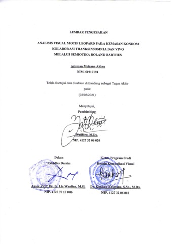Aklan, Azisman Meizana (2021) Analisis Visual Motif Leopard Pada Kemasan Kondom Kolaborasi Thanksinsomnia Dan Vivo Melalui Semiotika Roland Barthes. Other thesis, Univeristas Komputer Indonesia.