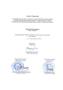 Dengan iklim usaha yang sedang bergeliat, tentu harus dimanfaatkan secara optimal. Tetapi dengan badan usaha berbentuk CV membuat pemanfaatan tersebut menjadi terbatas hal ini karena perpres 70/2012 pasal 100 ayat 3 yang menyatakan nilai paket pekerjaan sampai dengan 2,5 milyar atau diperuntukan hanya untuk usaha mikro, kecil dan koperasi kecil. Disamping itu untuk badan usaha CV sendiri tidak ada pembatasan harta kekayaan pribadi dan perusahaan, hal ini tentu sangat beresiko bagi pemilik perusahaan.Hal-hal tersebut tentu menjadi ganjalan tersendiri bagi usaha yang dijalankan oleh CV. Ruchi. Penelitian ini bertujuan untuk mengetahui kelayakan usaha yang sedang di kembangkan dalam pembuatan Laboratory & Scientific Glass Instrument dari aspek aspek pasar, aspek teknis manajemen, aspek hukum, Aspek lingkungan, aspek ekonomi sosial, serta aspek finansial. Studi kelayakan diperlukan untuk dapat dijadikan suatu bahan pertimbangan dalam pendirian usaha ini. Adapun dalam kelayakan studi kelayakan tersebut , dilakukan peninjauan-peninjauan terhadap aspek pasar, aspek teknis, aspek finansial, aspek hukum, serta aspek ekonomi dan sosial untuk mengetahui kelayakan dari pendirian dari usaha. Hasil dari analisa tersebut diperlukan guna mengetahui apakah rencana pendirian usaha ini akan menguntungkan secara ekonomis atau tidak Dari semua analisis yang dilakukan mulai dari aspek pasar, aspek hukum, aspek sosial ekonomi, aspek teknis dan manajemen, aspek lingkungan, serta aspek finansial dapat disimpulkan bahwa usaha yang dijalankan oleh CV. Ruchi sangat layak dalam semua aspek-aspek tersebut.