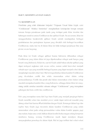 Gojek merupakan sebuah perusahaan teknologi yang didirikan pada tahun 2010 yang memiliki layanan utama berupa pengantaran orang menggunakan ojek yang dipesan secara online. Pada tahun 2019 Gojek meluncurkan logo dan tagline baru sebagai bentuk evolusi menjadi super app dengan lebih dari 20 layanan dalam satu aplikasi. Untuk menyampaikan hal tersebut Gojek menggunakan iklan yang berjudul Cerdikiawan. Iklan ini mengisahkan Cerdikiawan yang merupakan orang-orang cerdik yang selalu memiliki solusi untuk setiap situasi untuk merepresentasikan aplikasi Gojek. Hal ini merupakan salah satu faktor yang membuat iklan ini menarik untuk dikaji. Pada penelitian ini, tanda visual dan verbal dikaji menggunakan teori semiotika Ferdinand de Saussure untuk mengungkap makna dibalik tanda-tanda pada iklan tersebut, lalu dicari hubungan antara Cerdikiawan dan Gojek menggunakan teori pictorial metaphor Charles Forceville. Hasil dari penelitian ini adalah bahwa tanda-tanda yang ada pada iklan ini menunjukan bahwa karakter Cerdikiawan yang memiliki banyak akal dalam menghadapi masalah mewakili Gojek yang memiliki beragam solusi untuk setiap situasi.