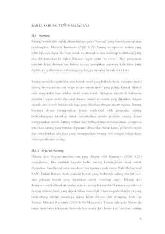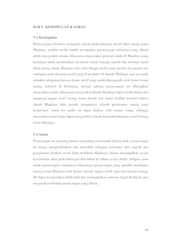 Sarung tenun merupakan salah satu produk utama andalan daerah Kecamatan Majalaya yang terkenal di Nusantara pada periode antara 1930-an sampai dengan 1970-an, daerah ini dianggap sebagai pelopor industri sarung tenun tekstil kontemporer Indonesia. Adanya peralihan teknologi yang lebih modern menyebabkan terancamnya identitas motif lokal sarung tenun Majalaya tersaingi oleh produk sarung tenun hasil printing, dengan motif dari berbagai brand ternama, untuk memenuhi kebutuhan segmentasi pasar. Hal ini menyebabkan sebagian besar generasi muda di daerah Majalaya saat ini tidak mengetahui identitas asli motif lokal sarung tenun terdahulu yang diproduksi secara tradisional. Dalam hal ini Buklet merupakan media yang berfungsi sebagai solusi untuk informasi tentang sejarah perkembangan motif lokal sarung tenun kepada masyarakat daerah Majalaya khususnya dan masyarakat luas pada umumnya. Diharapkan perancangan ini dapat memberikan manfaat dan wawasan mengenai sejarah tradisi budaya tenun dengan beragam motif lokal dari daerah Majalaya.