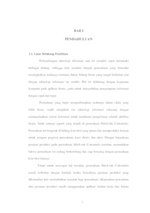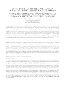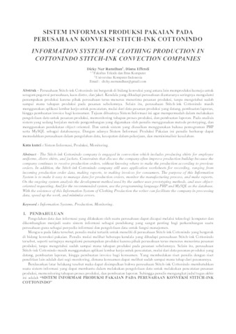 – Perusahaan Stitch-ink Cottonindo ini bergerak di bidang konveksi yang antara lain memproduksi kemeja untuk seragam pegawai perusahaan, kaos distro, dan jaket. Kendala yang dihadapi perusahaan diantaranya seringnya mengalami penumpukan produksi karena pihak perusahaan terus-menerus menerima pesanan produksi, tanpa mengetahui sudah sampai mana tahapan produksi pada pesanan sebelumnya. Selain itu, perusahaan Stitch-ink Cottonindo masih menggunakan aplikasi lembar kerja untuk pencatatan, mulai dari data pesanan produksi yang datang, pembuatan laporan, hingga pembuatan invoice bagi konsumen. Tujuan dibuatnya Sistem Informasi ini agar mempermudah dalam melakukan pengelolaan data untuk pesanan produksi, memonitoring tahapan proses produksi, dan pembuatan laporan. Pada analisis sistem yang sedang berjalan metode pengembangan yang digunakan oleh penulis menggunakan metode prototyping, dan menggunakan pendekatan object oriented. Dan untuk sistem yang diusulkan menggunakan bahasa pemograman PHP serta MySQL sebagai databasenya. Dengan adanya Sistem Informasi Produksi Pakaian ini penulis berharap dapat memudahkan perusahaan dalam pengolahan data, kecepatan dalam pekerjaan, dan meminimalisir kesalahan.