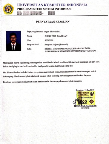 Ramdhan, Dicky Nur (2019) Sistem Informasi Produksi Pakaian Pada Perusahaan Konveksi Stitch-Ink Cottonindo. Other thesis, Universitas Komputer Indonesia.