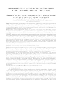 Manajemen gudang pada perusahaan Vessel Store selama ini masih dilakukan secara manual tanpa sistem yang terstruktur, sehingga hal tersebut menyebabkan kurang teraturnya suplai barang untuk memenuhi kapasitas barang yang ada didalam gudang. Oleh karena itu dilakukan sebuah penelitian yang memiliki tujuan untuk membangun sebuah sistem informasi manajemen gudang berbasis website pada perusahaan vessel store yang efektif dan efisien agar pengelolaan gudang pada perusahaan vessel store lebih efektif dan teratur. Metode penelitian ini menggunakan metode observasi dan wawancara secara langsung dengan pihak terkait. Sementara metode pengembangan sistem dilakukan dengan menggunakan metode pengembangan prototype,serta menggunakan metode pendekatan sistem berorientasi objek,untuk bahasa pemrograman dan sistem basis data yang digunakan adalah php&mysql. Penelitian ini menghasilkan sebuah aplikasi sistem informasi manajemen gudang berbasis website,yang diharapkan dapat meningkatkan efektifitas dan efisiensi pada sistem pengelolaan gudang di perusahaan Vessel Store, yang diharapkan dapat memudahkan pihak perusahaan dalam mengelola gudang. Oleh karena itu dilakukan sebuah penelitian yang memiliki tujuan untuk membangun sebuah sistem informasi manajemen gudang berbasis website pada perusahaan vessel store yang efektif dan efisien agar pengelolaan gudang pada perusahaan vessel store lebih efektif dan teratur. Penelitian ini menghasilkan sebuah aplikasi sistem informasi manajemen gudang berbasis website,yang diharapkan dapat meningkatkan efektifitas dan efisiensi pada sistem pengelolaan gudang di perusahaan Vessel Store, yang diharapkan dapat memudahkan pihak perusahaan dalam mengelola gudang.