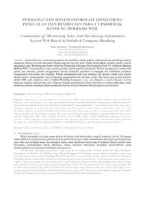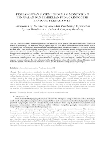 Sistem informasi monitoring penjualan dan pembelian adalah aplikasi untuk membantu pemilik perusahaan memantau bisnisan nya dan memantau kinerja pegawai nya dari jauh. Untuk memecahkan masalah tersebut penulis mengambil judul “Pembangunan Sistem Informasi Monitoirng Penjualan Dan Pembelian Pada CV. Indodesk Bandung Berbasis Web”. Jenis penelitian yang penulis gunakan adalah penelitian akademis. Penulis menggunakan sumber data primer dan sekunder, penulis menggunakan metode deskriptif, penelitian di lapangan dan melakukan penelitian menggunakan data primer dan sekunder. Penulis mendapatkan data dari lapangan dan internet, teknik yang penulis lakukan dalam mengumpulkan data berdasarkan pengumpulan data dan data output. Alat bantu yang penulis gunakan adalah UML yaitu singkatan dari ( Unified Modelling Language ), use case diagram, scenario diagram, activity diagram, sequence diagram dan class diagram. Setelah pembangunan sistem informasi ini selesai, diharapkan dapat membantu pemilik perusahaan dalam memantau bisnisan nya dan memantau kinerja pegawai nya dari jauh