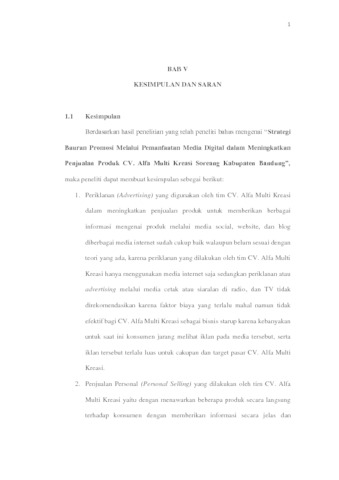 Hasil penelitian menunjukan bahwa Periklanan (advertising) dijadikan sebagai strategi promosi dalam meningkatkan penjualan produk Promosi Penjualan (sales promotion) merupakan strategi rangsangan terhadap konsumen. Hubungan Masyarakat (public relations) tidak digunakan sebagai strategi promosi CV. Alfa Multi Kreasi karena dianggap kurang sesuai oleh CV. Alfa Multi Kreasi sebagai start up business. Penjualan Perseorangan (personal selling) Praktik ini dilakukan di pasar swalayan dengan menawarkan produk secara langsung. Informasi dari mulut ke mulut (word of mouth) strategi WOM cukup efektif dalam meningkatkan penjualan serta memperkanlkan produk baru terhadap konsumen. permasaran langsung (direct marekting) strategi ini dilakukan melalui media sosial.Kesimpulan penelitian ini adalah strategi bauran promosi melalui pemanfaatan media digital dalam meningkatkan penjualan cukup efektif di era digital.