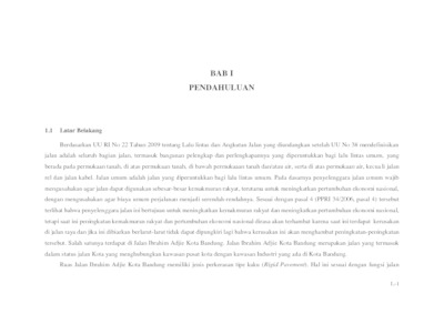 Jalan umum pada dasarnya digunakan sebagai akses untuk meningkatkan pertumbuhan ekonomi dan kemakmuran rakyat. Dalam meningkatkannya seringkali terhambat karena terdapat jalan yang mengalami kerusakan sehingga menghambat hal tersebut dan mempengaruhi kinerja suatu jalan. Jalan Ibrahim Adjie merupakan salah satu jalan di Kota Bandung yang menjadi salah satu akses masyarakat dalam melakukan kegiatan. Kerusakan jalan pada perkerasannya tidak dapat dipisahan dari kepadatan lalu lintas yang mempengaruhi bagaimana kinerja suatu jalan. Tujuan dari penelitian ini untuk menganalisa kerusakan jalan pada ruas jalan Ibrahim Adjie Kota Bandung. Metode yang digunakan pada penelitian ini adalah Metode Bina Marga. Hasil dari penelitian ini adalah berdasarkan penilaian kondisi didapat hasil yang cukup baik, sebagian besar kerusakan yang ditemukan di sepanjang ruas jalan ini adalah tambalan besar, retak linier, punchout dan gompal sudut. Jika dilihat dari skala prioritas yang telah dilakukan analisis untuk ruas Jalan Ibrahim Adjie, didapat rata-rata nilai pada urutan 6 (enam) untuk ruas jalan arah menuju Gatot Subroto – Soekarno Hatta dengan status penangan Pemeliharaan Berkala, sedangkan untuk arah sebaliknya yakni ruas Jalan Soekarno Hatta – Gatot Subroto mendapat nilai rata-rata pada urutan prioritas 8 (delapan) dengan status penanganan Pemeliharaan Rutin.