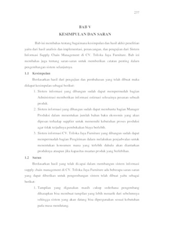 CV. TRILOKA JAYA FURNITURE memiliki permasalahan dalam menentukan estimasi selesainya pesanan produk untuk diberitahukan kepada konsumen, pengadaan bahan baku yang ekonomis dan kesulitan dalam melakukan penjadwalan untuk menentukan konsumen mana yang terlebih dahulu akan diantarkan produknya dan juga dalam mengatur pengiriman produk jika terjadi kelebihan muatan pada kendaraan pengiriman. Solusi dari masalah tersebut yaitu dengan membangun suatu sistem informasi supply chain management untuk membantu bagian administrasi agar dapat memonitoring banyaknya bahan baku yang akan dibeli, mengetahui sisa bahan baku dari produksi sebelumnya dan harga bahan baku tersebut, menentukan jumlah bahan baku agar sesuai dengan kebutuhan produksi dengan menggunakan Just in time (JIT), serta sistem untuk memonitoring penjadwalan pengiriman produk yang sesuai dengan kapasitas kendaran pengiriman dan membantu menentukan jarak terdekat pengiriman produk dengan menggunakan metode Travelling Salesman Problem (TSP). Berdasarkan hasil penelitian dan pengujian yang telah dilakukan pada sistem informasi supply chain management ini sudah dapat membantu perusahaan dalam mengatasi masalah yang ada. Sistem yang telah dibuat juga dapat dijadikan evaluasi untuk pengembangan peneliti pada masa yang akan datang.