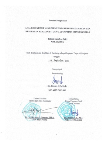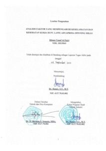 Al Fajri, Ikhsan Yusuf (2019) Analisis Faktor-Faktor Yang Mempengaruhi Keselamatan Dan Kesehatan Kerja Di Pt. Lawe Adyaprima Spinning Mills. Other thesis, Universitas Komputer Indonesia.