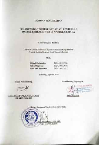Febriannisa, Ditha and Mujiargo, Ridik and Nurcakra, Rulli Eka (2016) Perancangan Sistem Informasi Penjualan Online Berbasis Web Di Apotek Cemara. Other thesis, Universitas Komputer Indonesia.