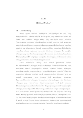 Bisnis apotek semakin menunjukan perkembangan ke arah yang menggembirakan. Semakin banyak usaha apotek yang bermunculan mulai dan apotek skala rumahan, hingga apotek yang merupakan usaha franchise. Perkembangan yang pesat itulah kemudian menjadi tantangan bagi perusahaan untuk berkompetisi dalam memperebutkan pangsa pasar.Perkembangan kemajuan teknologi saat ini membawa dampak yang positif bagi perusahaan. Keberhasilan perusahaan adalah bagaimana memenuhi kebutuhan pelanggan dan menjalin hubungan yang erat. Kesetiaan pelanggan akan menjadi kunci sukses, tidak hanya dalam jangka pendek tetapi juga keunggulan bersaing yang berkelanjutan karena pelanggan memiliki nilai strategik bagi perusahaan.