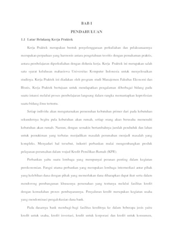 Perbankan yaitu suatu lembaga yang mempunyai peranan penting dalam kegiatan perekonomian. Fungsi utama perbankan yang merupakan lembaga intermediasi antar pihak yang kelebihan dana dengan pihak yang memerlukan dana diharapkan dapat ikut serta dalam mendorong pembangunan khususnya perumahan yang tentunya melalui fasilitas kredit dengan kemudahan proses pembayarannya. Penyaluran kredit merupakan kegiatan usaha yang mendominasi pengalokasian dana bank. Pada dasarnya bank membagi-bagi fasilitas kreditnya ke dalam beberapa jenis yaitu kredit untuk usaha, kredit investasi, kredit untuk korporasi dan kredit untuk konsumen, termasuk juga diantaranya Kredit Pemilikan Rumah (KPR). Setiap bank memiliki peraturan perbankan yang mewajibkan untuk melaksanakan prinsip kehati-hatian dalam pemberian kredit karena kegiatan ini mengandung risiko yang tinggi dapat mempengaruhi kesehatan dan kelangsungan usaha bank. Demikian pula pada prosedur pemberian KPR yang diharapkan dapat berjalan efektif dalam kegiatan operasional pemberian kredit tersebut.