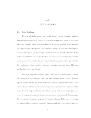 Teknologi berkembang sangat pesat dari tahun ke tahun dan memberikan dampak yang sangat besar bagi kehidupan di zaman modern. Teknologi dikembangkan dengan tujuan untuk memberikan kemudahan dalam memenuhi kebutuhan hidup manusia. Salah satunya adalah memberikan kemudahan dalam pengambilan informasi dan penyimpanan data informasi. Untuk memberikan kemudahan pada kegiatan pekerjaan maka dibuatlah rangkaian program . Khususnya yaitu program perekapan lapran data harian pad kantor Lembaga Penyiaran Publik Radio Republik Indonesia Bandung yang pada saat ini pengerjaan nya masih dilakukan secara manual. Rangkaian program yang dibuat dalam basis web dengan tujuan agar lebih mudah saat dioperasikan dan dikelola. Metode pendekatan pembuatan program yang digunakan kali ini adalah pendekatan berorientasi objek dengan menggunakan bahasa pemrograman PHP dan MySQL.