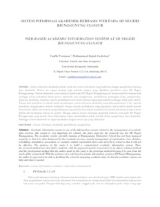 sistem informasi akademik adalah salah satu sistem informasi yang berkaitan dengan pengelolaan layanan data akademik. Sistem ini sangat penting bagi sekolah, tempat yang dijadikan penelitian yaitu SD Negeri Riunggununga. Sistem akademik yang sedang berjalan pada SD Negeri Riunggunung ini belum terkelola dengan baik sehingga sering terhambat dalam proses akademik yaitu pengelolaan pendaftaran, pembagian kelas, penjadwalan, abasensi, penilaian, misalnya seperti pendaftaran siswa harus datang langsung kesekolah sehingga tidak akan efektif. Tujuan dari penelitian ini adalah untuk membangun sistem informasi akademik yang terkomputerisasi. Lalu, metode penelitian menggunakan metode deskriptif, dengan metode pendekatan yang digunakan oleh peneliti adalah metode berorientasi objek, dan metode pengembangan yang penulis buat dalam penelitian ini adalah metode prototype karena dilihat dari kebutuhan sistem itu sendiri. Dengan adanya sistem informasi akademik berbasis web pada SD Negeri Riunggunung yang penulis buat diaharapkan dapat memudahkan pihak sekolah dalam pengelolaan data akademik. Sehingga sistem akademik ini dapat membantu dengan sesuai apa yang dibutukan.