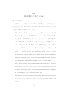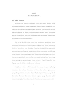 Hardware dan software merupakan salah satu elemen penting dalam pengembangan teknologi, dimana semakin baik kedua elemen ini semakin baik pula teknologi yang dihasilkan. Akan tetapi ada satu faktor penting yang perlu diperhatikan dalam memadukan kedua elemen ini, yaitu kecocokan satu sama lainnya. Untuk itu perlu dilakukan riset dalam menentukan hardware dan software yang digunakan. Bahkan penting juga untuk bisa mengidentifikasi apakah hardware dan software yang dipilih dapat bertahan untuk jangka panjang. Sama halnya yang terjadi pada proses pengembangan sistem Interactive Digital Wayfinding And Signage yang ada di Universitas Komputer Indonesia. Tujuan penulis melakukan riset terhadap kebutuhan hardware dan software pada pengembangan Sistem Interactive Digital Wayfinding And Signage yakni menemukan hardware dan software yang sesuai, menemukan solusi dari setiap permasalahan ketidakcocokan hardware dan software, meminimalisir human error yang sering terjadi saat penggunaan Sistem Interactive Digital Wayfinding And Signage. Dari riset yang dilakukan hasil yang diperoleh yakni untuk segi pencocokan hardware dan software adalah penginstalan beberapa software tambahan maupun fitur yang telah ada serta penambahan hardware yang disediakan, sedangkan dari segi human error menggunakan security program.
