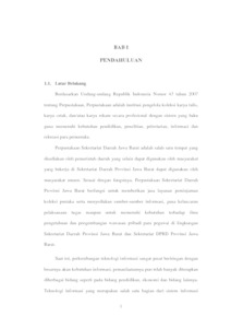 Perpustakaan Sekretariat Daerah Provinsi Jawa Barat berfungsi untuk memberikan jasa layanan peminjaman koleksi pustaka serta menyediakan sumber-sumber informasi, guna kelancaran pelaksanaan tugas maupun untuk memenuhi kebutuhan terhadap ilmu pengetahuan dan pengembangan wawasan pribadi para pegawai di lingkungan Sekretariat Daerah Provinsi Jawa Barat dan Sekretariat DPRD Provinsi Jawa Barat. Saat ini, perkembangan teknologi informasi sangat pesat, pemanfaatannya pun telah banyak diterapkan di berbagai bidang. Tak terkecuali di perpustakaan, diperlukan juga adanya sistem informasi manajemen perpustakaan yang memanfaatkan teknologi informasi, agar proses-proses yang dilakukan oleh perpustakaan dapat dilakukan dengan mudah dan efektif. Dalam penelitian ini, metode yang akan digunakan adalah metode deskriptif yaitu mendeskripsikan suatu keadaan atau fenomena yang terjadi pada objek penelitian apa adanya. Dalam perancangan sistem, penulis menggunakan metode pengembangan prototype serta metode pendekatan yang digunakan yaitu pendekatan terstruktur. Sistem informasi manajemen perpustakaan ini merupakan sistem informasi berbasis website yang dibuat menggunakan bahasa pemrograman PHP dan perangkat lunak pendukung lainnya yaitu PhpMyAdmin, MySQL, Notepad++ dan XAMPP. Dengan dirancangnya Sistem Informasi Manajemen Perpustakaan Sekretariat Daerah (SIMPUSETDA) Provinsi Jawa Barat ini, diharapkan dapat membantu petugas perpustakaan dalam melakukan proses pengelolaan data koleksi pustaka, pengelolaan data anggota, peminjaman dan pengembalian koleksi pustaka, mempermudah dalam melakukan pencarian koleksi pustaka dan mengakses e-book/e-journal.