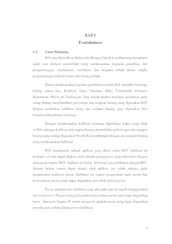 B4T atau Balai Besar Bahan dan Barang Teknik kota Bandung merupakan salah satu instansi pemerintah yang melaksanakan kegiatan penelitian dan pengembangan, standarisasi, sertifikasi, dan inspeksi teknik dalam rangka pengembangan industri bahan dan barang teknik. Penelitian dengan judul “Sistem Penjadwalan Rutin Kalibrasi Mesin Berbasis Web di Balai Besar Bahan dan Barang Teknik”, memiliki rumusan masalah penambahan penjadwalan kalibrasi mesin yang akan diterapkan di Balai Besar Bahan dan Barang Teknik, dan penjadwalan yang digunakan masih dalam bentuk manual. Penelitian ini bertujuan untuk Mempermudah informasi kepastian ketersediaan mesin kepada pegawai di Balai Besar Bahan dan Barang Teknik kota Bandung serta mempermudah pencarian data mesin di Balai Besar Bahan dan Barang Teknik. Metode yang digunakan dalam penelitian ini adalah metode pembangunan perangkat lunak. Adapun sumber data yang digunakan adalah data – data sekunder yang dimana diperoleh dari bagian sistem informasi. Berdasarkan penelitian diatas diperoleh kesimpulan bahwa sistem penjadwalan rutin kalibrasi mesin tersebut akan digunakan oleh staff pegawai khususnya dalam bidang kelibrasi mesin.