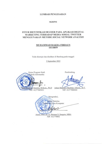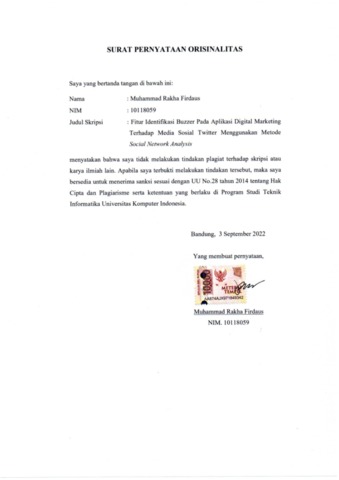 Firdaus, Muhammad Rakha (2022) Fitur Identifikasi Buzzer Pada Aplikasi Digital Marketing Terhadap Media Sosial Twitter Menggunakan Metode Social Network Analysis. Other thesis, Universitas Komputer Indonesia.