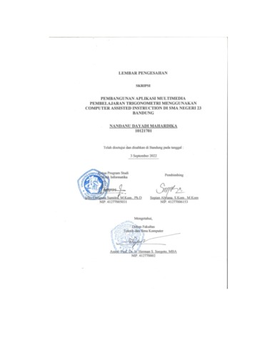 Mahardika, Nandanu Dayadi (2022) Pembangunan Aplikasi Multimedia Pembelajaran Trigonometri Menggunakan Computer Assisted Instruction Di Sma Negeri 23 Bandung. Other thesis, Universitas Komputer Indonesia.