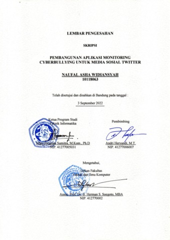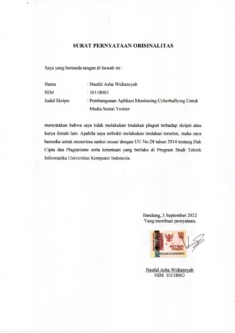 Widiansyah, Naufal Asha (2022) Pembangunan Aplikasi Monitoring Cyberbullying Untuk Media Sosial Twitter. Other thesis, Universitas Komputer Indonesia.