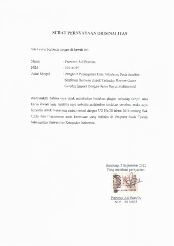 Perwira, Adi (2022) Pengaruh Penanganan Data Imbalance Pada Analisis Sentimen Berbasis Aspek Terhadap Review Game Genshin Impact Dengan Naïve Bayes Multinomial. Other thesis, Universitas Komputer Indonesia.