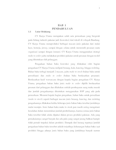 CV Karya Utama merupakan salah satu perusahaan yang bergerak pada bidang industri pakaian jadi (konveksi) dari tekstil di wilayah Bandung. CV Karya Utama menggunakan strategi make to order dalam proses produksinya. Terdapat 2 macam bahan baku yaitu make to stock dan make to order. Kepala bagian pengadaan sering mengalami kesalahan dalam menentukan jumlah pembeliannya, akibatnya yaitu dapat terjadi kekurangan bahan baku saat produksi hingga adanya jenis bahan baku yang jumlahnya banyak namun jarang terpakai. Dalam pemilihan supplier untuk bahan baku kain, kepala bagian pengadaan juga masih mengalami kesulitan karena setiap supplier memiliki harga, kualitas, dan kelengkapan yang berbeda – beda. Sehingga kepala bagian pengadaan kesulitan dalam mempertimbangkan aspek – aspek tersebut. Kesalahan dalam memilih supplier berpengaruh pada harga bahan baku yang lebih mahal dan akibatnya laba perusahaan menjadi berkurang, selain itu kualitas yang didapat juga terkadang kurang memuaskan. Tujuan penilitian ini adalah pembuatan sistem informasi manajemen pengadaan yang dapat membantu kepala bagian pengadaan dalam menentukan titik pemesanan kembali bahan baku dengan menggunakan metode Reorder Point(ROP) dan menentukan jumlah pengadaannya menggunakan metode Single Exponential Smoothing, serta membantu dalam menentukan supplier untuk pengadaan bahan baku menggunakan metode Weighted Product(WP). Berdasarkan hasil pengujian dapat disimpulkan bahwa sistem ini sudah membantu kepala bagian pengadaan dalam menentukan titik pemesanan kembali bahan baku, menentukan jumlah pengadaannya, serta menentukan supplier yang ideal.