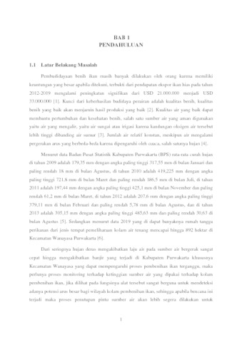 Pengembangan benih ikan masih banyak dilakukan karena menjadi salah satu usaha yang menjanjikan terbukti dari pendapatan ekspor ikan meningkat dari USD 21 juta menjadi USD 33 juta dalam waktu 7 tahun. Dalam proses pengembang biakan tentu saja bukan hal yang mudah untuk dilakukan, faktor yang mempengaruhi dari kegiatan tersebut salah satunya adalah cuaca. Curah hujan yang besar dapat mengakibatkan deras laju pada air di irigasi menjadi tinggi hingga dapat mengakibatkan banjir pada kolam perairan ikan, hal ini dapat berakibat buruk dalam proses pengembangan benih ikan. Namun sayangnya pemantauan ini masih dilakukan dengan cara melihat langsung pada irigasi dan pengoperasian buka tutup portal pintu air ini menggunakan tenaga manusia serta lokasi yang cukup jauh dari perairan kolam ikan sehingga membutuhkan waktu lebih. Dari permasalahan tersebut dibuatlah sistem yang dapat memantau jarak ketinggian air menggunakan Ultrasonic JSN-SR04T Waterproof, laju deras air menggunakan sensor YF-S201 Water Flow dan ada tidaknya hujan menggunakan sensor Raindrop FR-04 secara realtime yang dikendalikan oleh mikrokontroler Arduino Mega 2560 dan dapat mengoperasikan buka tutup portal pintu air secara otomatis. Karena lokasi yang jauh maka digunakannya modul LoRa E220-900T22D sebagai penghubung antara Arduino Mega 2560 yang berperan mengirimkan data dan NodeMCU ESP8266 berperan sebagai penerima data. Hasil pendeteksian yang didapat akan dikirimkan langsung ke database lalu ditampilkan pada web. Penelitian ini menggunakan metode prototype dalam pembangunannya dan menggunakan metode black box dalam pengujiannya. Pengembangan alat ini dapat membatu dalam proses pengembangan benih ikan.